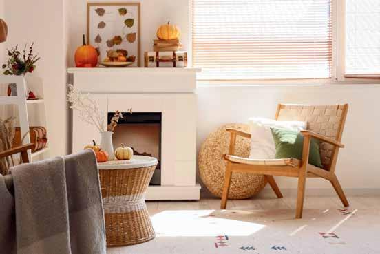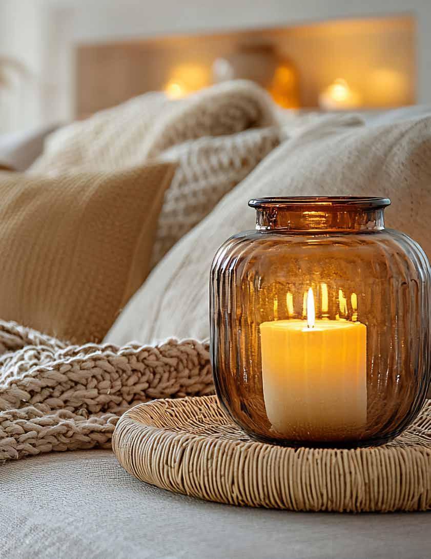 • Create a warm interior with layered throws, pillows, and flameless candles.