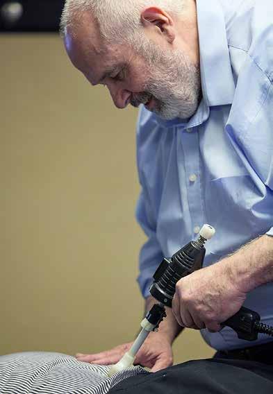 One of the most impressive tools at Dr. Chapman’s disposal is the ProAdjuster 360 which measures the motion in individual joints to help him see how the joint is moving. It then sends pulses into the joint to reduce spasms and restore motion. He discovered this treatment personally when he injured his wrists. “It was a silver lining in a dark cloud in my life and helped me to continue to practice,” he says. “If I can provide relief without the popping and cracking and the twisting and turning by using technology, then I can take all the fear out of chiropractic. Chiropractic isn’t dangerous, but if you think it is then that fear is real to you, and I respect that. If I can take that fear away by using a different technique, we can accomplish the same goals and have an even greater effect.”