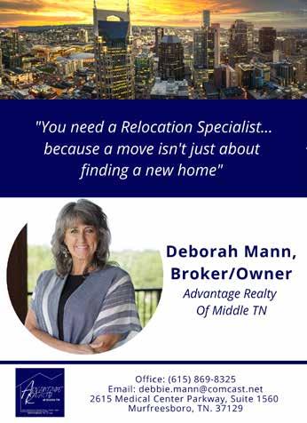(575) 578-9517 | brandimosby.com HEALTH AND COMMUNICATION COACH/CONSULTANT Health encompasses more than just physical. We need to focus on our overall health (mind, body, soul). I help women in the social work, healthcare, and first responder fields to focus on their health, in order to better help service their community. Communication Coaching: I believe communication is key in every relationship, business or personal. Communication consulting for businesses • Individual communication coaching • 8 week program (45 minute weekly sessions) • Habit change coaching methods What will I learn? • Effective communication • Understanding perspective • How to deliver and receive messages • Speaking with body language Health Coaching: I believe change begins on the inside. Mental weight loss creates physical weight loss. 8 week program (45 minute weekly sessions) • Personal training • Habit change coaching methods What will I learn? • What “diet” works best for my body • Who am I being when I’m eating • What emotion am I trying to convey through food • What physical activity do I enjoy Recognizing Health in All Aspects of Life Call to schedule a gifted discovery session. “You need a Relocation Specialist... because a move isn’t just about finding a new home” Most professional power washing services in Rutherford County Residential & Commercial House | Roof | Concrete waterlyco.com | (615) 653-2857 11| CITYLIFESTYLE.COM/MURFREESBOROSEPTEMBER 2022