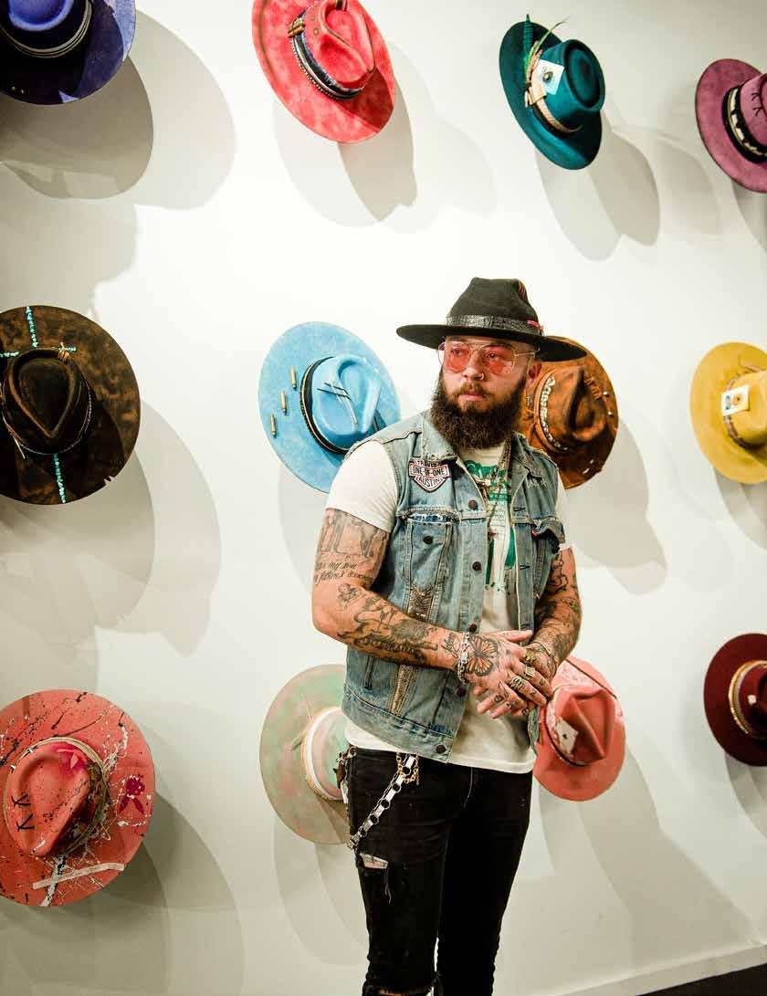 “I want to put 1000 dollars on your back.” -Travis Austin art gallery-themed showroom. At the hat bar, people can custom create their hats guided by staff members, using everything from paint and ribbon to iconic photos of celebrities. The showroom also contains a fully stocked cocktail bar accessible to all. The theme "Outlaws Never Die" is evident throughout the showroom, from the fash ion to the building's construction. Nashville is primarily known for music, hence the name Music City. However, Travis wants to make fashion just as significant. Being an incredibly confident person himself, Travis found that clothes play an essential role in one's level of self-esteem and confidence. Knowing this, he firmly believes in creating custom pieces for his clients as it brings them a unique sense of beauty and confidence in wearing something specifically made for them and no one else. Even the famous designer Karl Lagerfeld said, "fashion is a language that creates itself in clothes to interpret reality." Travis holds vast aspirations for his company and is making extraordinary headway. In 2023, showrooms will open in New York and Paris, with ten additional locations opening across the globe in the next five years. However, in the next six months, Travis Austin Customs will become an official fashion house with women's and men's clothing lines, shoes, and more. Travis is determined to create a space for outlaw fashion in Haute Couture and is succeed ing every day. For more information about Travis Austin and his custom creations, visit his Instagram at @travisau stincustoms or his website, travisaustincustoms.com
