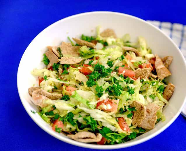 1. Mix the parsley, tomatoes, onion, radishes, garlic, lemon juice, olive oil, salt, and pepper in a large bowl. Reserve the iceberg lettuce, pita bread, and feta cheese for later steps.