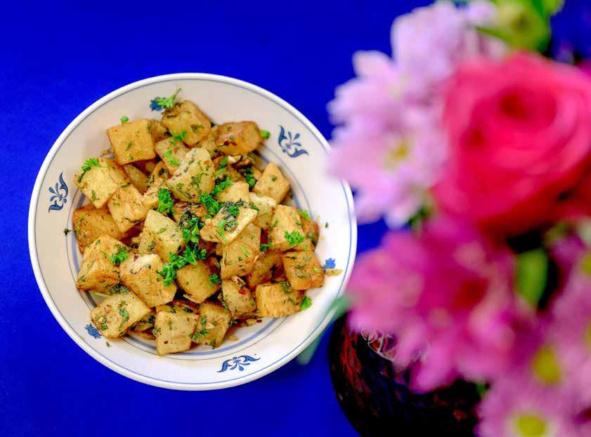 8. Evenly coat a wide pan with vegetable oil. Heat on low and add cilantro, garlic, and salt. Stir for about a minute, until fragrant and a slight color change is noticed. Mix in the fried potatoes, then add lemon juice.