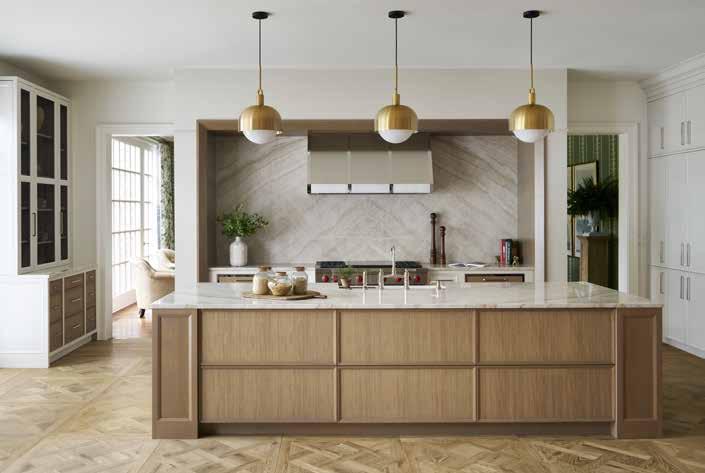 Warm, natural woods are defining modern kitchen design, says Linda Larisch, senior designer, CMKBD, DDK Kitchen Design Group. “Light-stained woods, especially rough-cut white oak and walnut, are taking center stage, offering organic textures and timeless appeal,” she says. “Designers are moving away from bold colors, cherry and maple in favor of softer, lighter tones that exude a natural and airy vibe.” The 3/4-inch “skinny” shaker remains a top pick, often paired with soft whites, matte black, and honey gold accents.