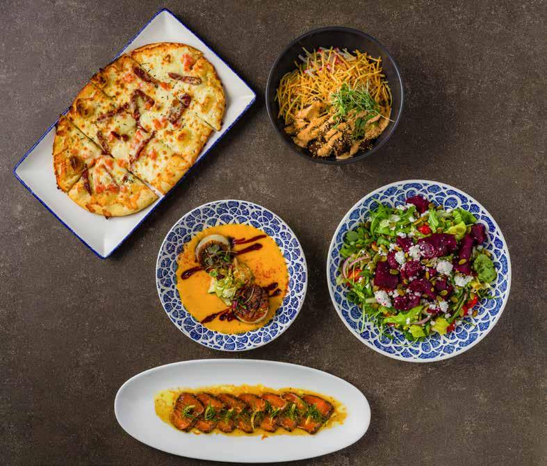 grilled octopus; famous beef shawarma, and fun appetizers like smoked Lebanesestyle wings and ouzo-spiked saganaki with shrimp, charred shishito peppers and grilled crostini.