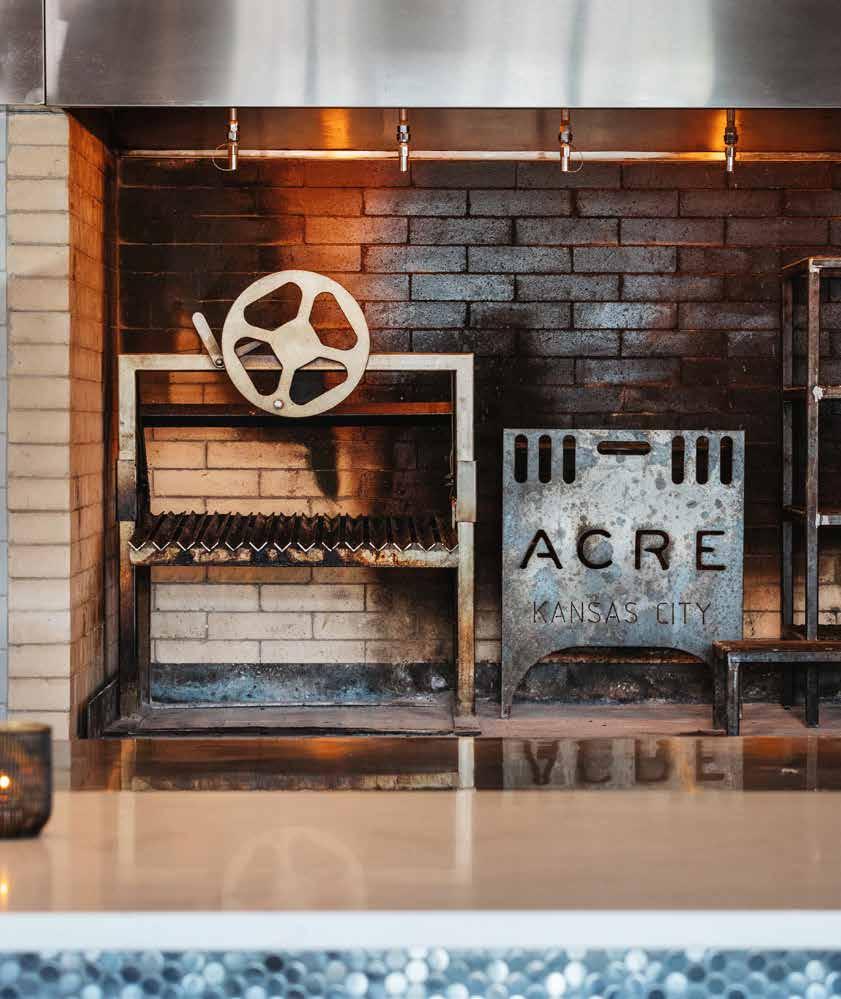Trees were a significant source of inspiration for Andrew and the Kansas City-based architectural firm, Herron + Partners. Like fire, trees are an invit ing natural element that provides comfort and hos pitality. One wall that composes the bar is adorned with an impressive wine rack that is embedded with a wrought iron tree sculpture. The acoustic tiles that adorn the ceiling are etched with a tree branch pat tern and a custom painting by local painter Jennifer Janesko ties in the organic textures of the restaurant with its striking scenery. What accompanies each meal beyond the kitchen is a good ole’ helping of Midwestern hospitality. The new culinary hot spot is more concerned with how guests feel at the end of their meal than dishing out shock and awe. Despite the refined design, Acre is intent on not taking itself too seriously and takes pride in providing an approachable dining experi ence where guests can enjoy familiar favorites. It’s the fearless use of butter throughout the menu, the seasonings that would make grandma proud, and the knowledge that fried chicken will never go out of style. In the essence of genuine Midwestern hospital ity, at Acre, comfort and quality reign supreme.