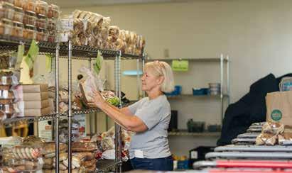 A volunteer places bread on a shelf at the Worthington Resource Pantry