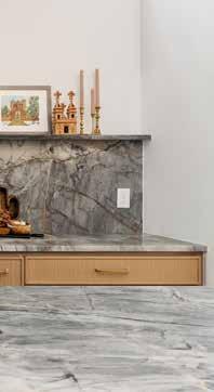 Bottom left: This bathroom features an elegant freestanding tub. The 6’ tall Blue Cascade Quartzite adds a bold touch to an otherwise spa-like setting.