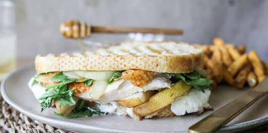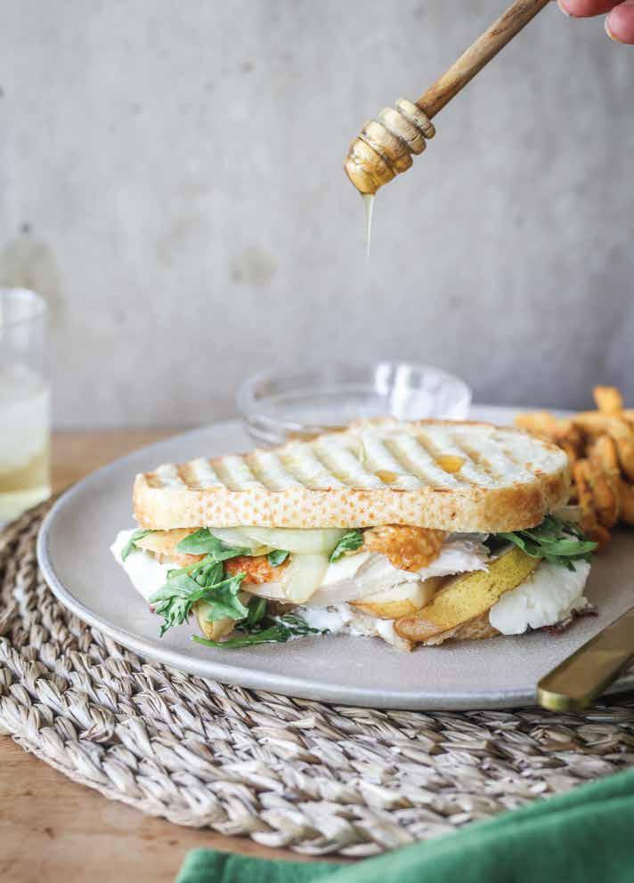 Spread goat cheese on one side of the bread. Top the cheese with arugula, caramelized onions, sliced pears and chicken breast. Drizzle with honey. Top with remaining slice of sourdough bread. Use a griddle or panini press to heat the sandwich.