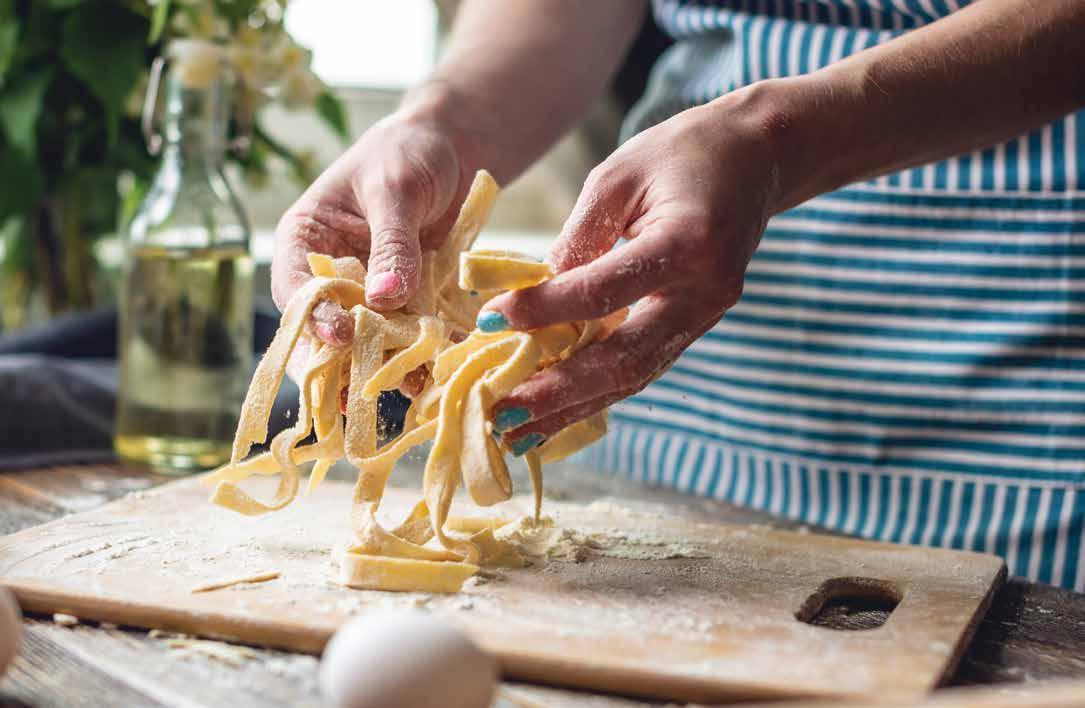 1. Mound the flour in the center of a work surface with a well in the middle. Crack the eggs into the well and beat with a fork until smooth, then work flour into eggs with the fork. Use a bench scraper to work in the rest of the flour a little at a time. When the flour is incorporated, form the dough with your hands into a rounded mass for kneading. Lightly dust your workspace with flour and knead dough about 10 minutes, until smooth and elastic. Cover dough with a bowl or plastic wrap and rest 1 1/2 hours, or chill overnight.