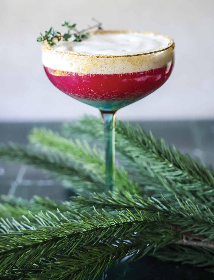 A bright, elegant cocktail with a foamy top and a hint of holiday spirit.
