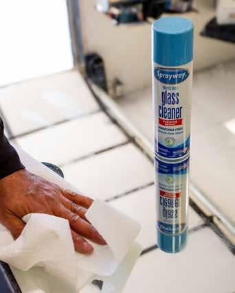 Glass surfaces—whether they are shower doors, windows or mirrors—quickly accumulate dust, water stains and other contaminants. Mandy emphasized that using the right cleaning products is essential. “Ammonia-based cleaners like Windex may leave streaks and damage the surface over time,” she explained. Instead, use ammonia-free glass cleaners to ensure longevity and prevent deterioration. Sprayway glass cleaner is preferred over Windex in the glass industry due to its cost, effectiveness and ingredients.