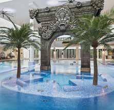 Amenities include Hydrotherapy pools, saunas, steam rooms, lounges, eateries, and wellness workshops.