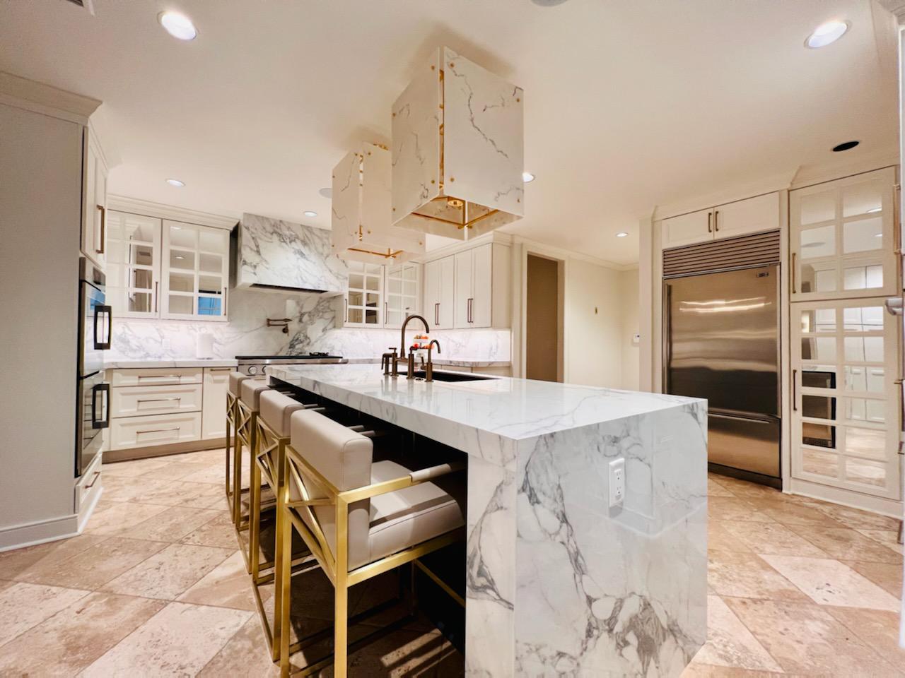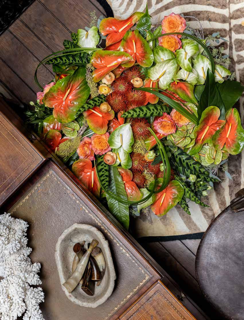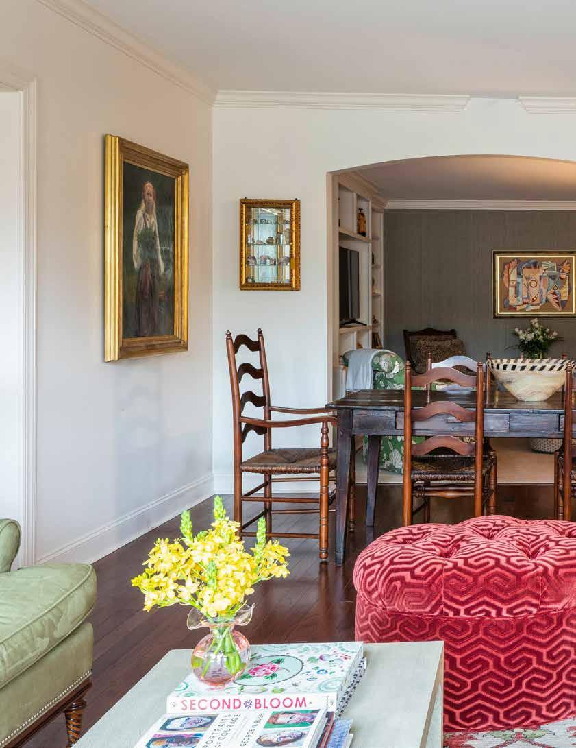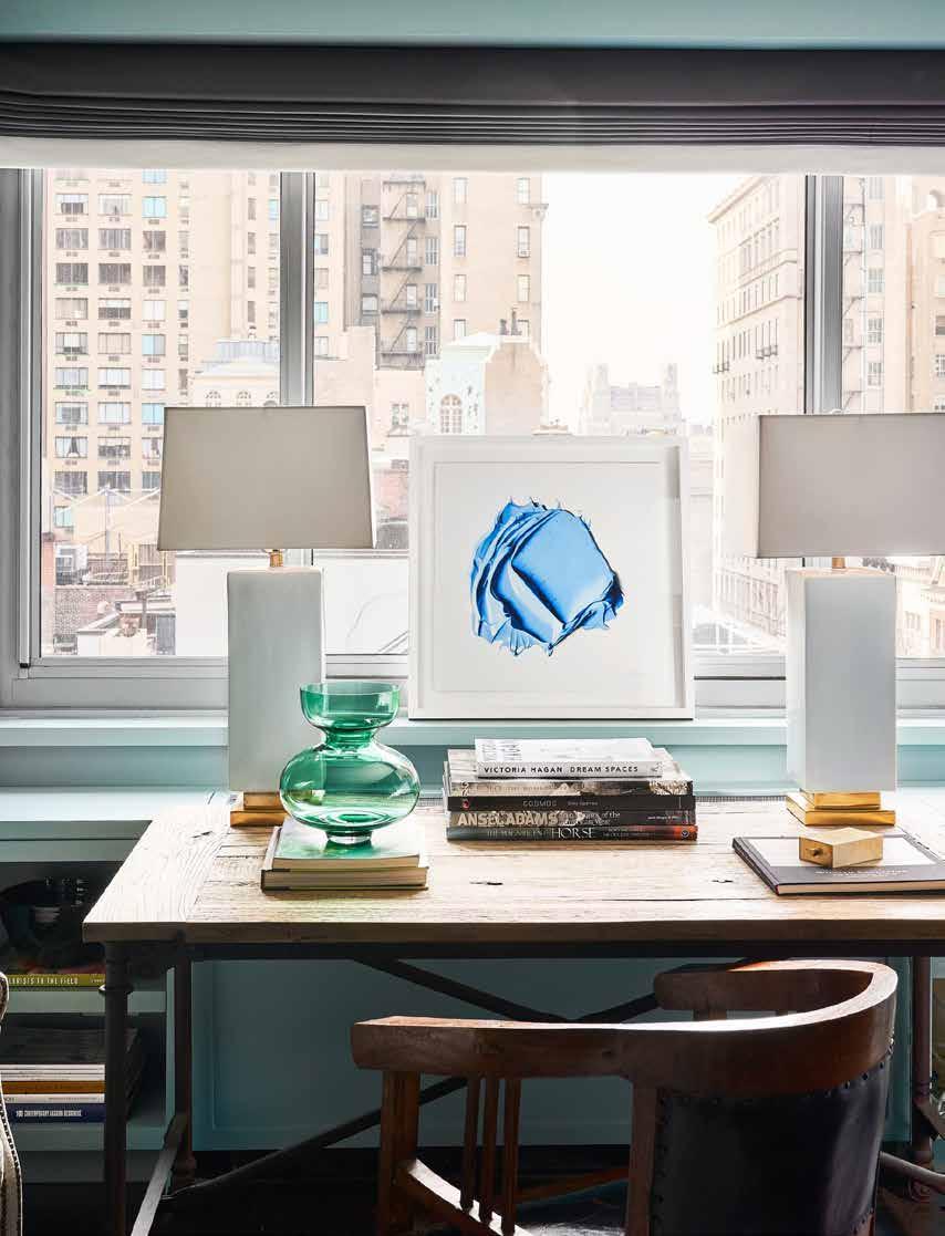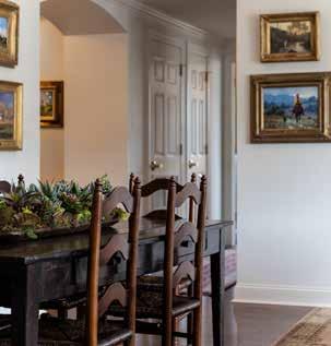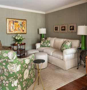 I love all color but tend to lean towards more rich, saturated colors, as well as earthy tones that have great depth. I love to mix wood types, metal finishes, ceramic, glass and a variety of fabrics in a space. I strive to vary the textures of fabrics as well—like upholster ing a velvet chair with a leather contrast welt. I love pattern mixing and will often combine a structured pattern like a stripe or check with something more organic, such as a watercolor floral pattern. If a fabric has a really interesting pattern with incredible colors, it can inspire the design of an entire Accessorizingroom! a space is a great way to work in vin tage and antique items, as well as personal touches. I will always buy vintage books, glassware, brass items and oddities to have on hand. I have a storage unit full of them yet can never seem to have enough! They help bring interest to a room and contribute to the origi nal, personalized, layered feeling I want every room we design to have. I strongly believe that art is critical to the success of the design of a room. I lean towards large-scale, original art, and I like to mix a variety of styles and mediums in a space. I also believe in the importance of thoughtful, quality art framing.