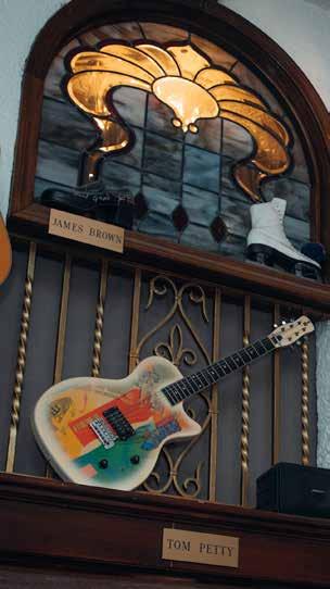 alive and well in the shop. Julie points out a blue sweater that Elvis wore in Jailhouse Rock “Both men and women wear it.” Blue suede shoes embroidered with TCB are next to guitars signed by Lansky fans like Tom Petty and Robert Plant. Not everything is rock and roll style. They also carry European lines like 7 Downie St. and Meyer, along with American sportswear lines like Johnnie-O and Greyson.