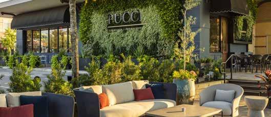 The interiors of Pucci Café, designed by the Houston-based Gin Design Group, exude a European charm. With curvaceous millwork, accent lighting that creates a warm ambiance, and cascading greenery, the atmosphere is inviting and elegant. Plush textiles in rich jewel tones with houndstooth accents add