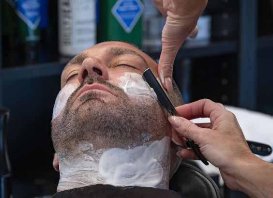 First, the stylist preps the face with pre-shave oil, then uses a series of steam towels to soften whiskers. Hot lather and a straight razor follow. “I think that’s where some of the art comes in. Everyone’s face is shaped differently; their beards are different, and they want different styles,” says Owner Rebecca Webster.