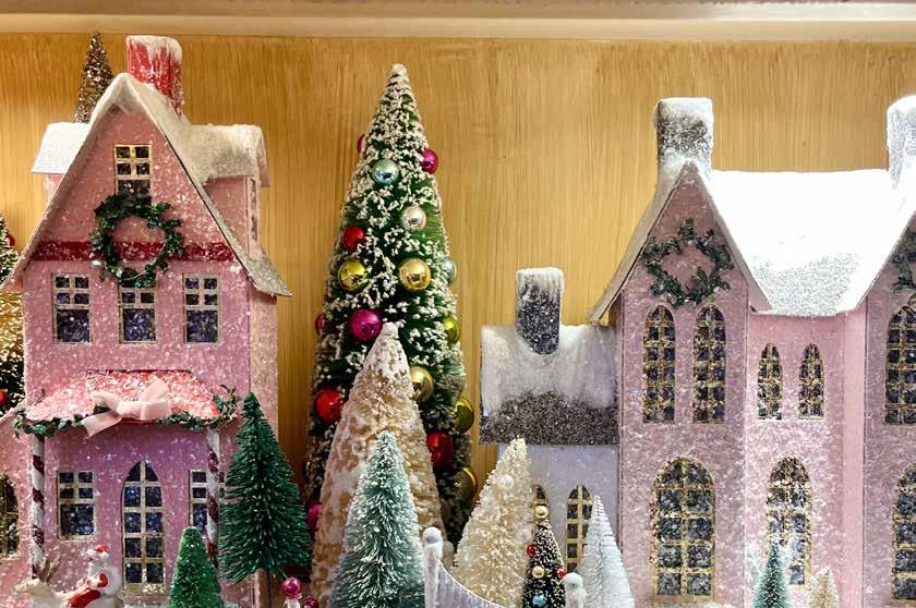 The shop doesn’t just put up decorations—it creates atmosphere. Garlands drape across antique hutches. Ornaments glitter from every corner. Classic nutcrackers stand tall next to delicate glass baubles. Tiny houses with glowing windows invite you down snowy cobblestone streets.