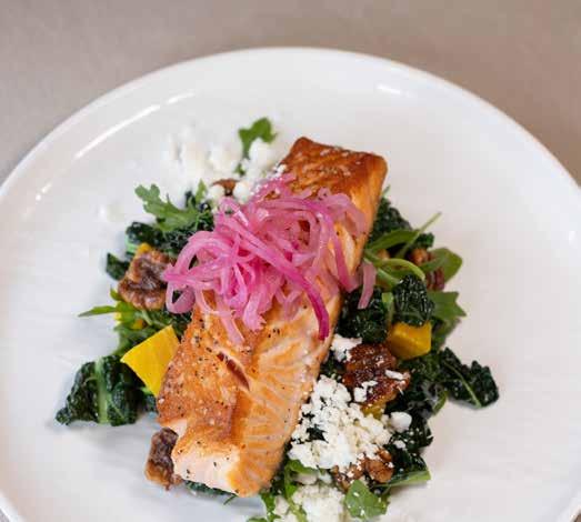 7. Add your kale, beets, arugula, and pickled onions into a large bowl. Drizzle with olive oil and a squeeze of fresh lemon juice. Top with candied walnuts and goat cheese. Serve with your beautifully seared salmon.