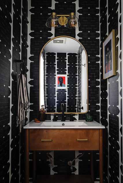 This powder room was inspired by the beautiful pattern in this wallpaper, Demerara Groove, created by local artist, Kisha Damali. The moment I saw it I was stunned. I love the stark contrast between the black and white, the subtle texture layered in the pattern, the movement, and the ancestral history embodied in its name. I echoed contrast in the gold and black metals of the fixtures and decorative elements, balanced with a warm walnut wood vanity. The art prints I selected demonstrate the power and beauty of Black people.