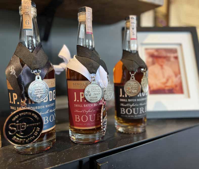 craftsmanship and ingredients, including clean and crisp Washington water. Add that to the locally grown corn as well as winter wheat, sourced from a single farm in Quincy, WA, let it “ferment and steep” for 7 days and then distill in a copper pot still, made in Eugene, OR and the next small batch of J.P. Trodden small batch bourbon is underway. Once the blending and later the aging process, anywhere from 3 to 10 years depending on the bourbon, has been completed, each is bottled in glass proudly sourced from Tennessee.