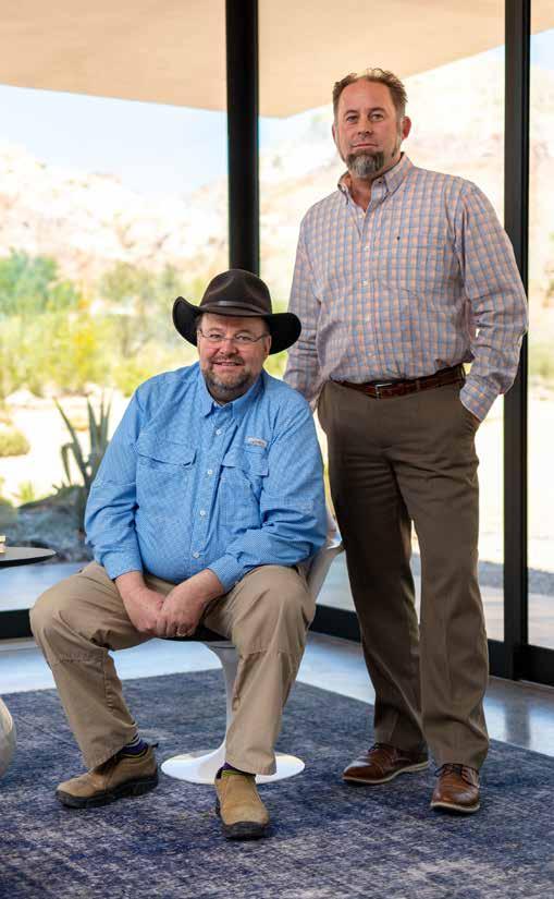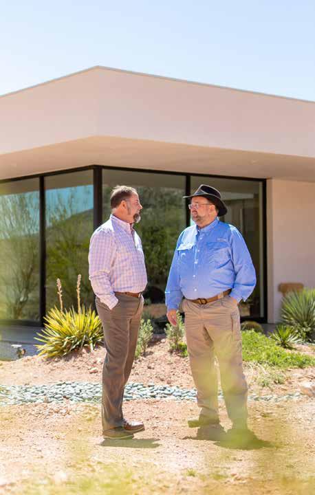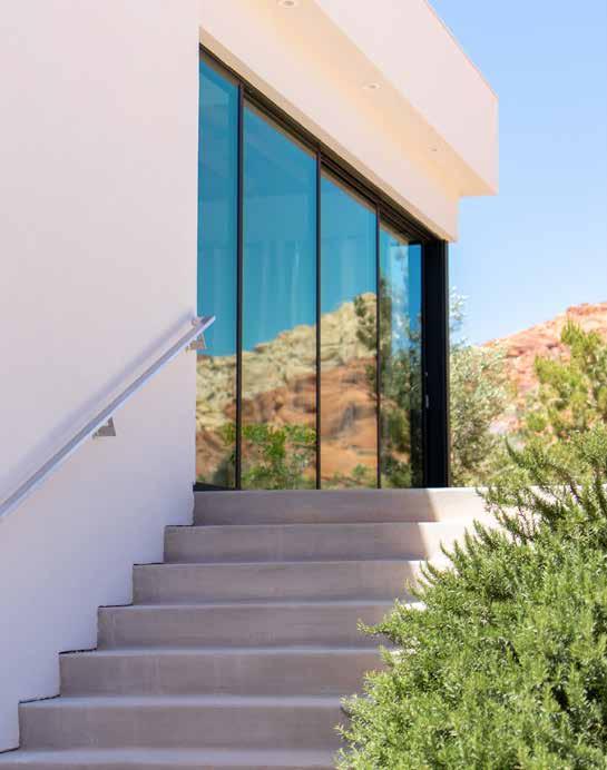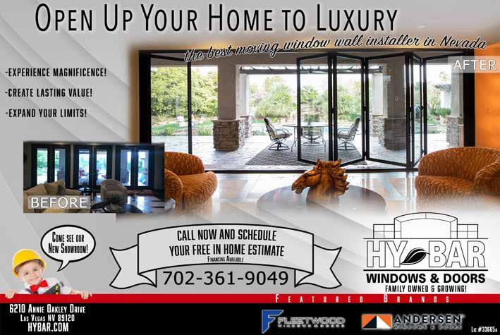 “Indoor-outdoor architecture” was first described by advertisers and magazines following the end of World War II when developers and realtors first began plan ning open and spacious suburbs where American domesticity met the tranquility of nature. Inspired by Frank Lloyd Wright’s organic designs and Mies van der Rohe’s glasshouses, indoor-outdoor architecture tested the boundaries between inside and outside while expanding the physical foot print of family homes. Today, perhaps more than ever, peo ple crave open, light-filled homes with access to extended outdoor living spaces. As a result, critical elements in today’s indoor-outdoor architecture are quality windows and doors. No one knows this better in Las Vegas than Hyrum and Russ Barlow, brothers and co-owners of HyBar Windows and TraditionallyDoors.windows and glass doors functioned as a feature allowing natural light while also protecting and insulating a home. However, today’s massive seamless windows and doors can frame a house, slide, fold, and pivot beautifully while pro tecting it from nature’s most extreme ele ments. For Las Vegas, this means UV rays, blazing outdoor temperatures, high winds, and torrential downpours.