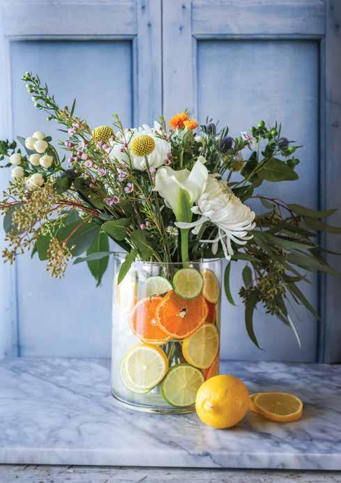 Add an extra burst of color and texture to your floral arrangement by layering fruit around the edges of your vase. To achieve this, place a smaller vase inside a larger one, ensuring the flowers stay contained in the inner vase to preserve their shape. Fill the surrounding space with water and then arrange sliced fruit along the vase’s outer sides. For a fresh touch, add ice cubes to keep the fruit looking vibrant longer and to hold them in place. Not only will the flowers’ fragrance fill the air, but the citrus notes from the fruit will add a refreshing scent.