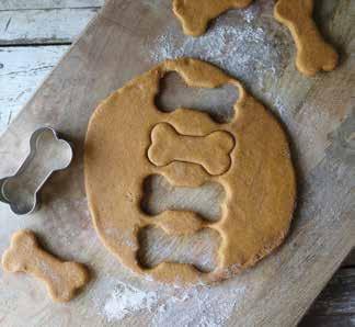 Preheat oven to 350 degrees and line baking sheet with parchment paper. In a bowl, mix all ingredients except flour and blend well. Gradually add the flour until the dough isn’t sticky. Roll dough into a ball. Lightly flour your surface and lightly knead. Use a rolling pin to roll dough to ¼-inch thickness. Use cookie cutters and place dough on baking sheet. Bake for 20-25 minutes. Drizzle with peanut butter (optional).