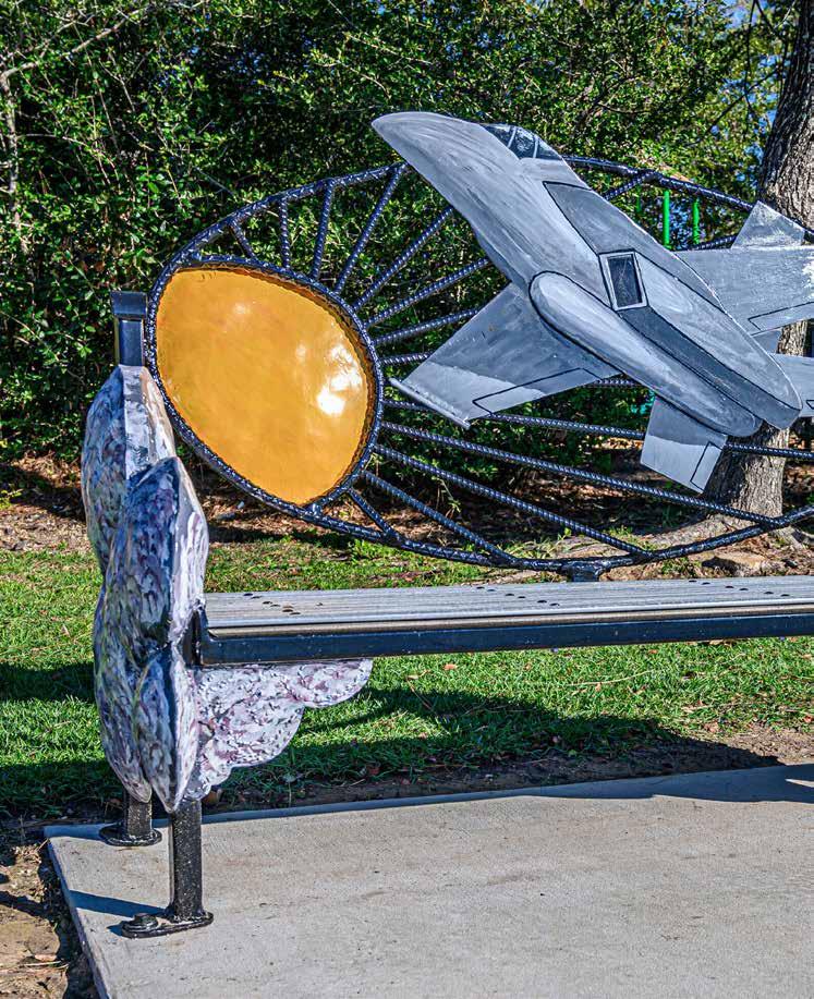 “Windswept Oak,” also created by artist Jonathon Chandler, incorporates his signature use of found and recycled materials. “We have a responsibility to protect the earth, so I use recycled materials whenever possible,” he explained. Underwriters Rob and Cindy Hardin’s vision to share the sense of hope and fulfillment they experienced when they arrived in The Woodlands – dreams that they have realized over the years – is captured in the bench located in Town Green Park. With a full view of the waterway, it embodies the feelings of serenity, connection to nature and a deep sense of community.