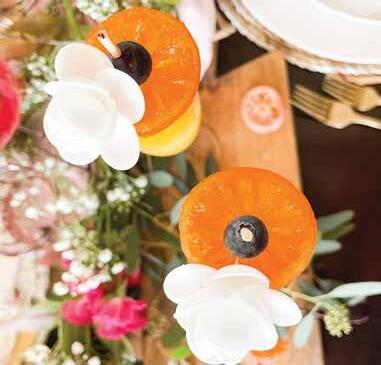 At the heart of this spectacular spread, a bouquet of floral offerings takes center stage featuring assorted chocolate florets, delicate white rose wafers, and salami and cheese blossoms. Perfectly crafted and delicious, they establish the visual and gastronomic theme for the entire display. Accompanying the spread are glasses adorned with edible floral rims, beckoning you to sip and savor the essence of spring; dried lavender, marigold, rose, lemon peel and lily garnishes provide vibrancy and are entirely edible. Elevate the visual appeal with rosefolded napkins and a sprinkle of seasonal flowers atop layers of fresh greenery.