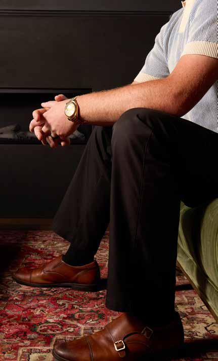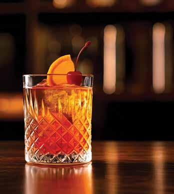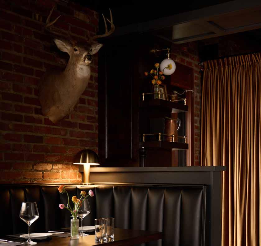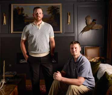 The concept was born from a striking black-andwhite photo of the brothers at Woolaroc—wearing cowboy hats and business suits with effortless charm. That image became the soul of Barons: refined yet grounded. Inside, you’ll find shimmering Art Deco finishes alongside warm Western elements. A mounted buffalo head echoes the one that once presided over Waite’s office, while nods to Frank’s favorite horse, Babe, are thoughtfully woven throughout the space.
