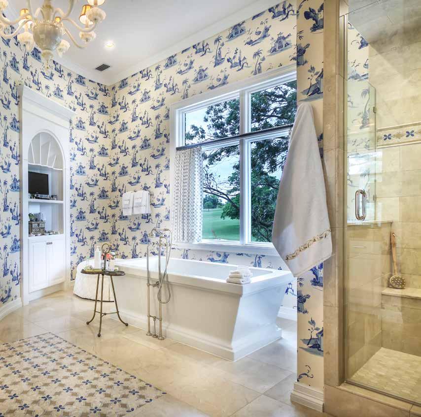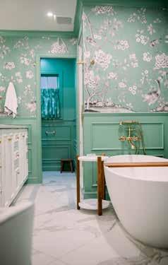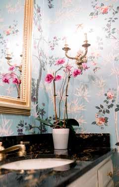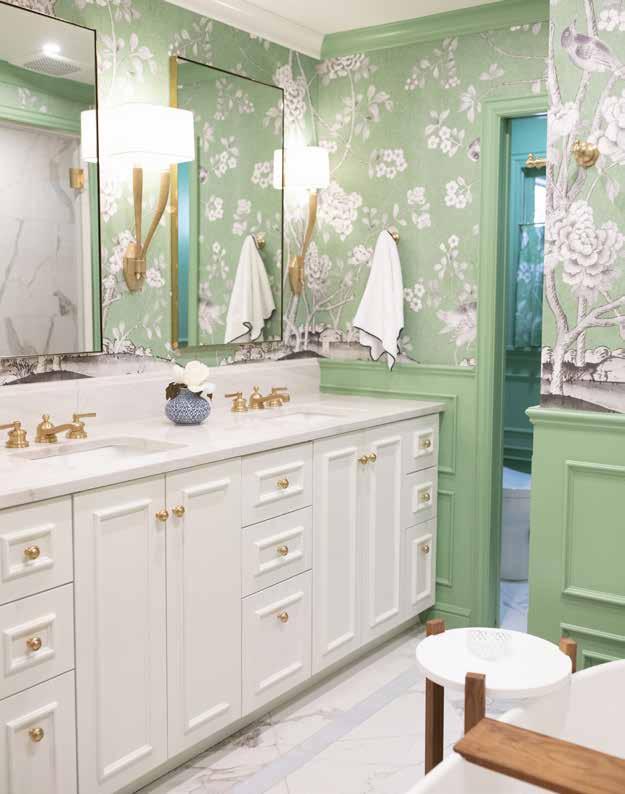 marble floors with an inlaid powder blue-marble border. I balanced the green with Benjamin Moore White Dove cabinetry and gold mirrors and sconces. The effect is simply beautiful.”