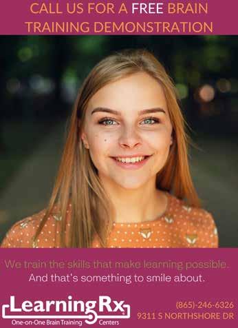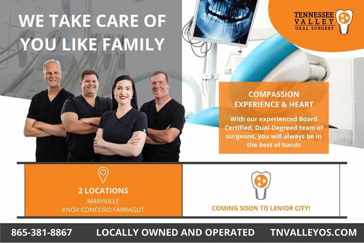 From sunrise to sunset, enjoy the peak of mountain living. Live your luxury. CINDY KRAUS ©2022 Engel & Völkers. All rights reserved. Each brokerage independently owned and operated. Engel & Völkers and its independent License Partners are Equal Opportunity Employers and fully support the principles of the Fair Housing Act. CINDY KRAUS Engel & Völkers Knoxville 11347 Parkside Dr. . Knoxville . TN, 37934 865.221.8601 Learn more at knoxville.evrealestate.com 865.357.3030 | SKINTENTIONALBEAUTY.COM | 318 ERIN DR. . KNOXVILLE It’s time for change. At Skintentional Beauty Spa we strive to treat your skin with intention. Skin Loving Products · Skin Treatments · Makeup Services May Special Save $10 for every $100 purchased on gift certificates. NOW OPEN Aardvark Family Services During Covid-19, government guidelines will be observed. Clients will be screened for fever and symptoms. Masks must be worn in common areas or as per parenting plan/court order. Parents will need to provide toys, etc. for the appointments. Supervised Visitation & Safe Child Exchange On-& Off-site monitoring in 2, 4, or 6 hour sessions. Monday-Saturday from 8-8 and Sunday noon-6. Parenting Classes available. Located in Cedar Bluff near KAT bus stop. Helping parents and their children build positive relationships 865-850-6828 // aardvarkfamilyservices.com info@aardvarkfamilyservices.com 48