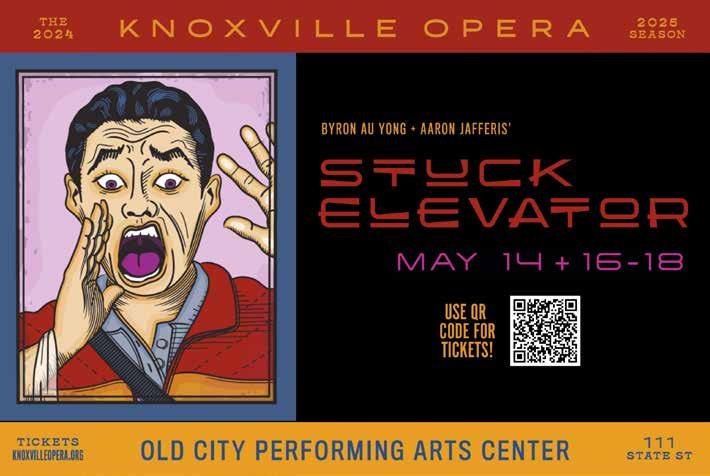 This opera from Byron Au Yong and Aaron Jafferis is based on the dramatic true story of an immigrant delivery man trapped in an elevator for 81 hours. Through a blend of music, spoken word, and multimedia, this co-production with River & Rail Theatre Company delivers a unique and impactful theatrical experience. May 14-18. KnoxvilleOpera.org/Stuck-elevator