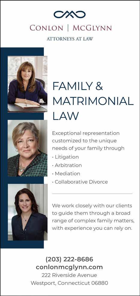 CAROLE TOPOL ORLAND, ESQ. CO-FOUNDING PARTNER 2022 READERS’ CHOICE 2021 CITY PICK Westport, thank you for voting us BEST FAMILY LAW FIRM ERIC J. BRODER • CAROLE TOPOL ORLAND • SARAH E. MURRAY • ASHELY M. ALBINI CHRISTOPHER J. DEMATTIE • NICOLE M. DIGIOSE • ROBERT D. VOSSLER SAMUEL V. SCHOONMAKER IV • SUE GEORGIADES • MICHAEL R. CHIRCO 203-222-4949 • www.ctfamilylaw.com 55 GREENS FARMS ROAD, WESTPORT, CT 06880 115 EAST PUTNAM AVENUE, GREENWICH, CT 06830