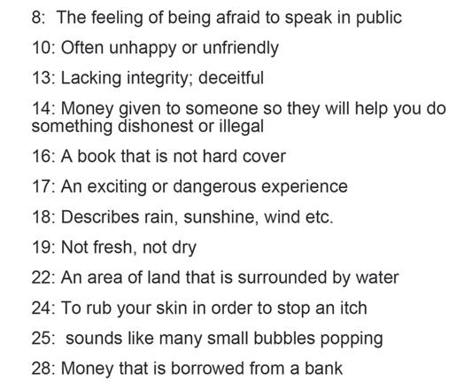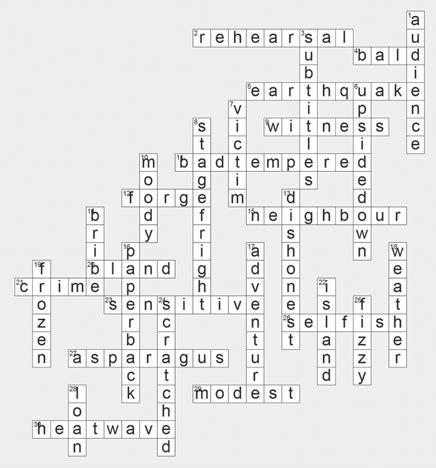 6 7 8 10 13 14 16 17 18 19 22 24 25 28 across:across: down:down: 2: An event where you practice to prepare for a public performance 4: With little or no hair on the head 5: Occurs when the plates of the earth start to move 9: A person who sees something happen 11: Angry and aggressive