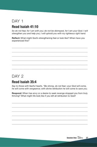 DAY 2 Read Isaiah 35:4 Say to those with fearful hearts, “Be strong, do not fear; your God will come, he will come with vengeance; with divine retribution he will come to save you. Respond: When has envy or a desire to seek revenge stopped you from truly thriving? What might life look like if you left all retribution to God?