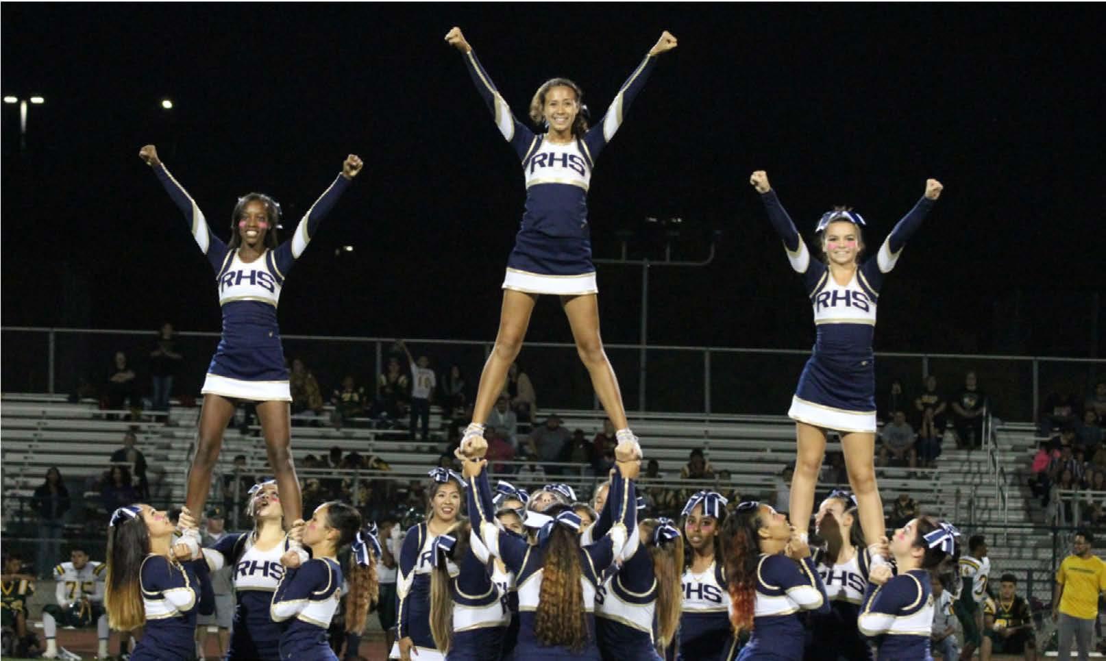 Cheerleaders demonstrate a triple lift, inspiring the crowd to cheer their team to a victory. The lift was part of the team’s state award-winning performance last summer.