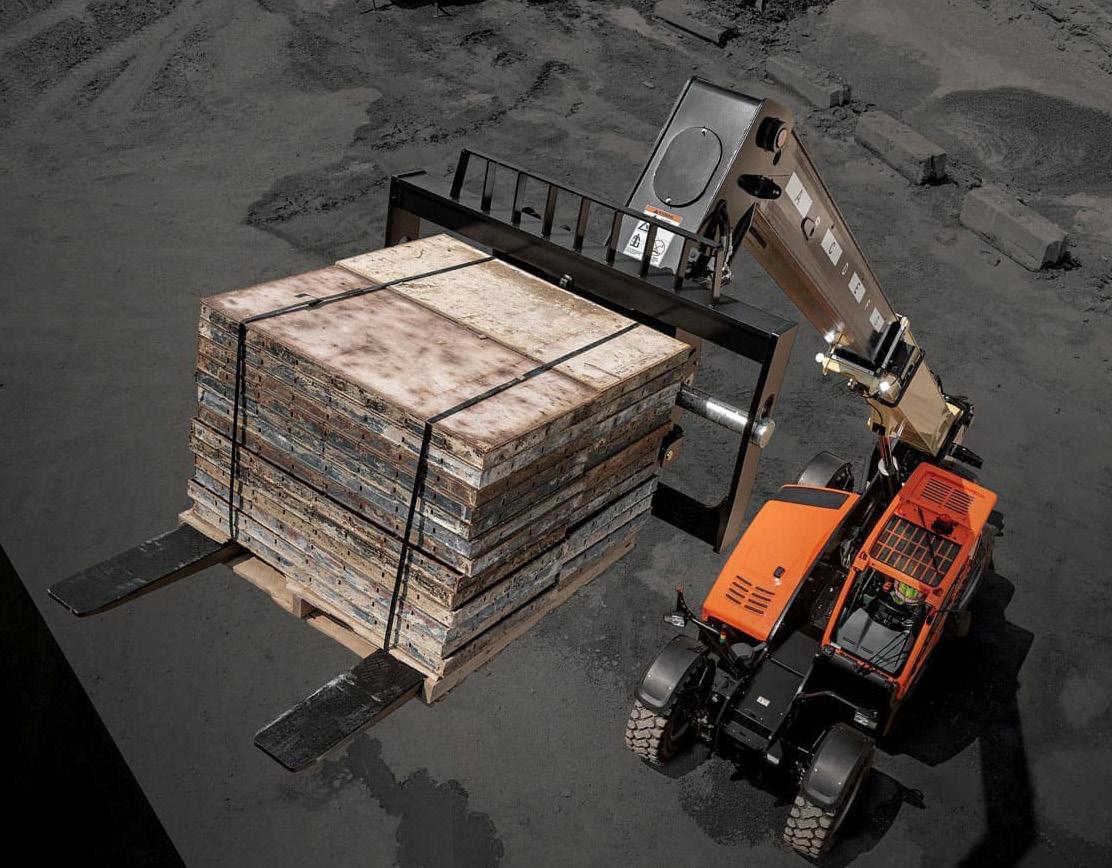 Telescopic handlers, or telehandlers for short, were first developed to replace vertical-mast forklifts and forklift trucks because these machines’ telescoping booms enable operators not only to reach high but also to reach out. This allowed for loads of job site materials, like bricks, to be raised up and into 4-5 story buildings. Telehandlers have evolved since their introduction into the market, and today’s models are defined as either fixed or rotary, depending on whether or not the machine is equipped with a rotating turret. Fixed-boom telehandlers became extremely popular for pick-andcarry work around construction sites thanks to their ability to lift and extend loads directly in front of them.