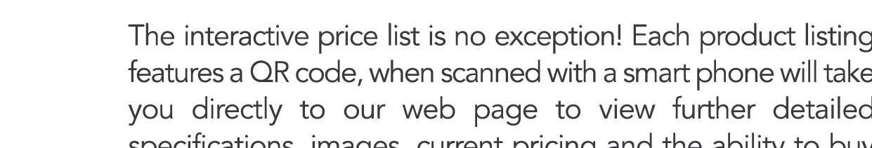 This interactive Product Guide is crammed with all of the products that we know you need - each featuring a QR code, that when clicked or scanned with a smart device, will take users directly to the web page to view further detailed specifications, imagery, pricing, and most importantly, the ability to purchase online from almost anywhere in the world.