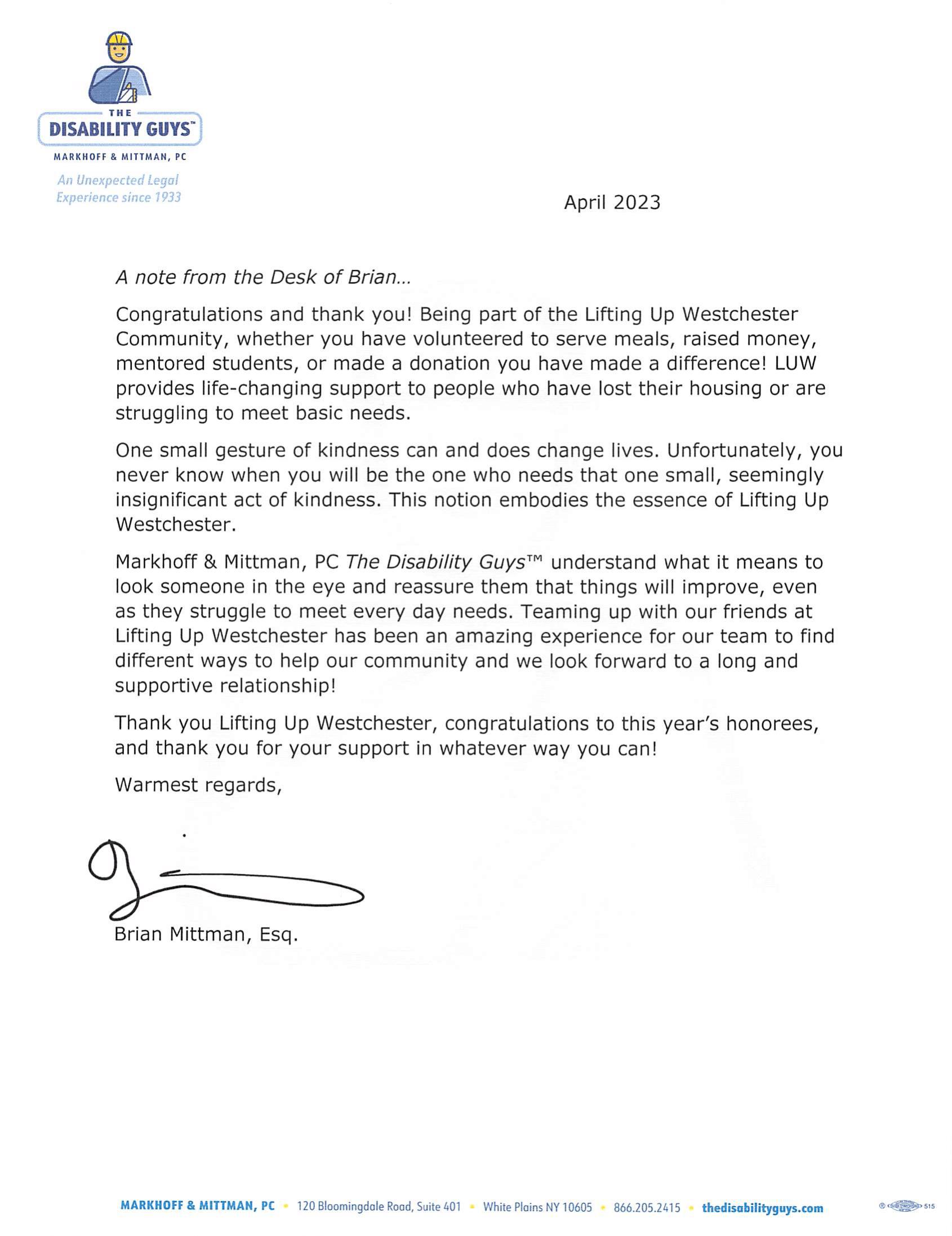 We are pleased to have so many members of the Lifting Up Westchester (LUW) family along with many new faces here with us this evening. Your belief in our organization has made it possible for us to permanently change the trajectory of the lives of so many members of our Westchester community.