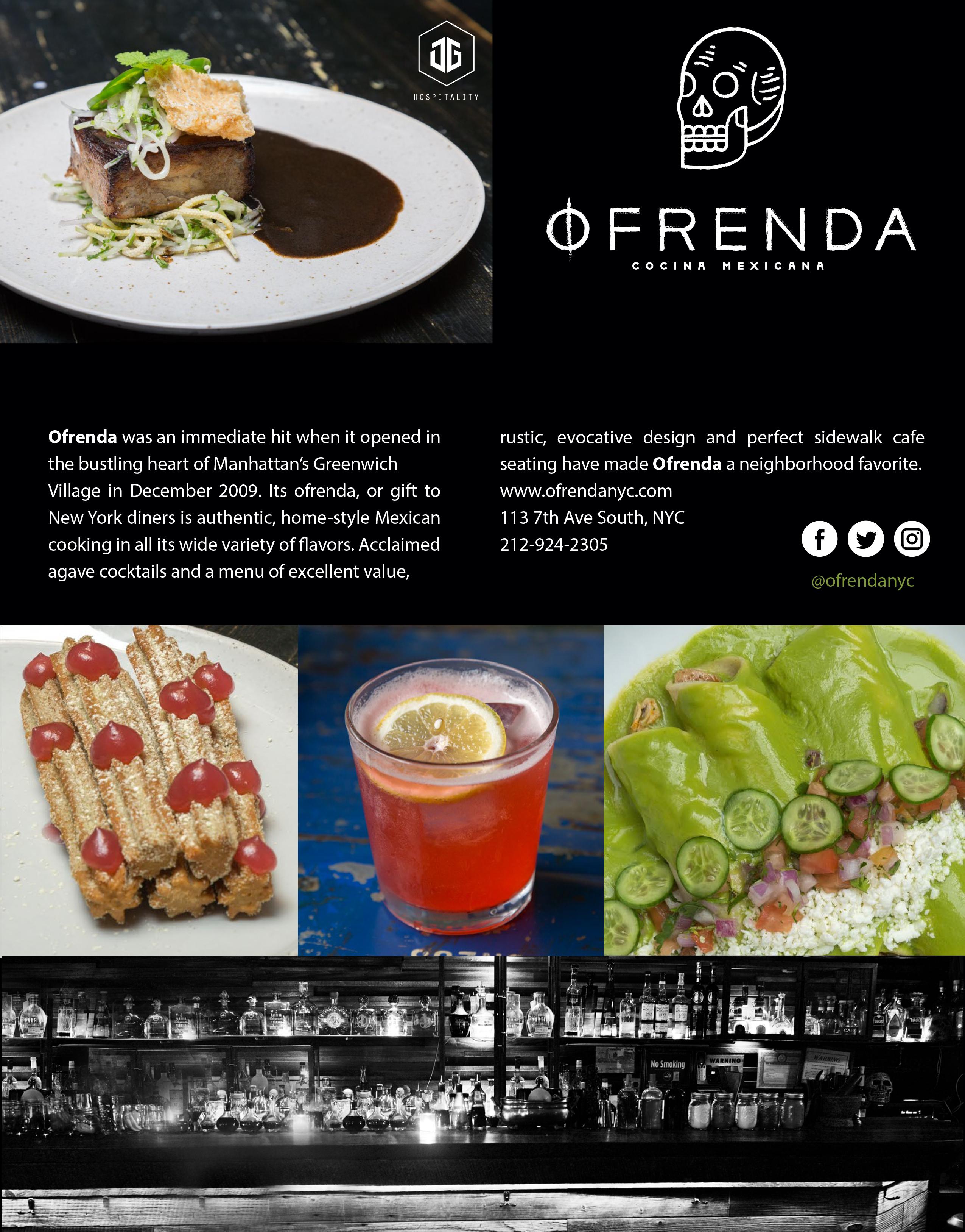 In December 2009, at the age of 26, Jorge Guzman seized an opportunity to partner with respected chef Luis Mota to found Ofrenda Cocina Mexicana, in New York’s West Village. Ofrenda was an immediate hit when it opened. Its ofrenda, or gift to New York diners is authentic, home-style Mexican cooking in all its wide variety of flavors. Acclaimed agave cocktails and a menu of excellent value, rustic, evocative design and perfect sidewalk café seating have made Ofrenda a neighborhood favorite.