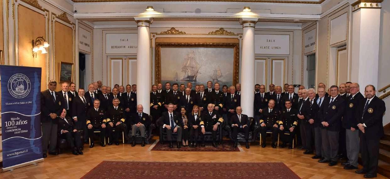 de la Liga Marítima de Chile, Edmundo González Robles, la vicepresidenta Macarena Frutos Lazzaro, el director secretario de Liga Marítima, Juan Carlos Galdámez, el director ejecutivo de Ligamar, Renato Casas-Cordero, y los directores Hugo Barra, Carlos Valderrama, Claudio Morales, quien además es Vicepresidente ejecutivo de ASONAVE, el socio de Ligamar Ángel Labbé y representantes de empresas asociadas