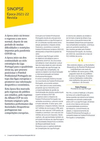 O Anuário do Futebol Profissional Português resulta de uma parceria estratégica entre a Liga Portugal e a EY. O conteúdo reunido nesta sexta edição apresenta o impacto direto financeiro, económico e social do Futebol Profissional na época 2021-22, destacando a importância global do setor.