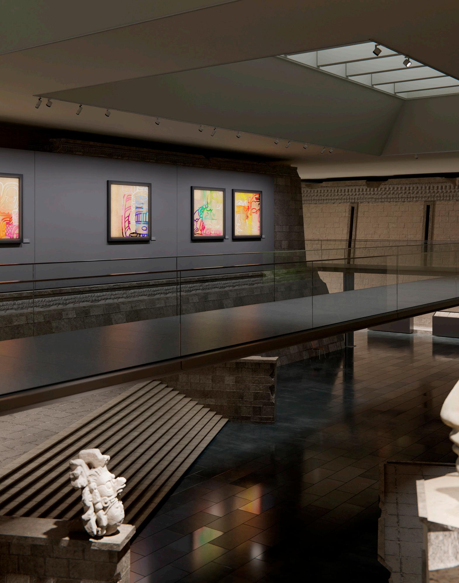 Exposición The Beginning en el APMA, Seúl Los proyectores de contornos iluminan los cuadros con haces de luz perfectamente definidos. Casi parece que los cuadros emiten luz por sí mismos.