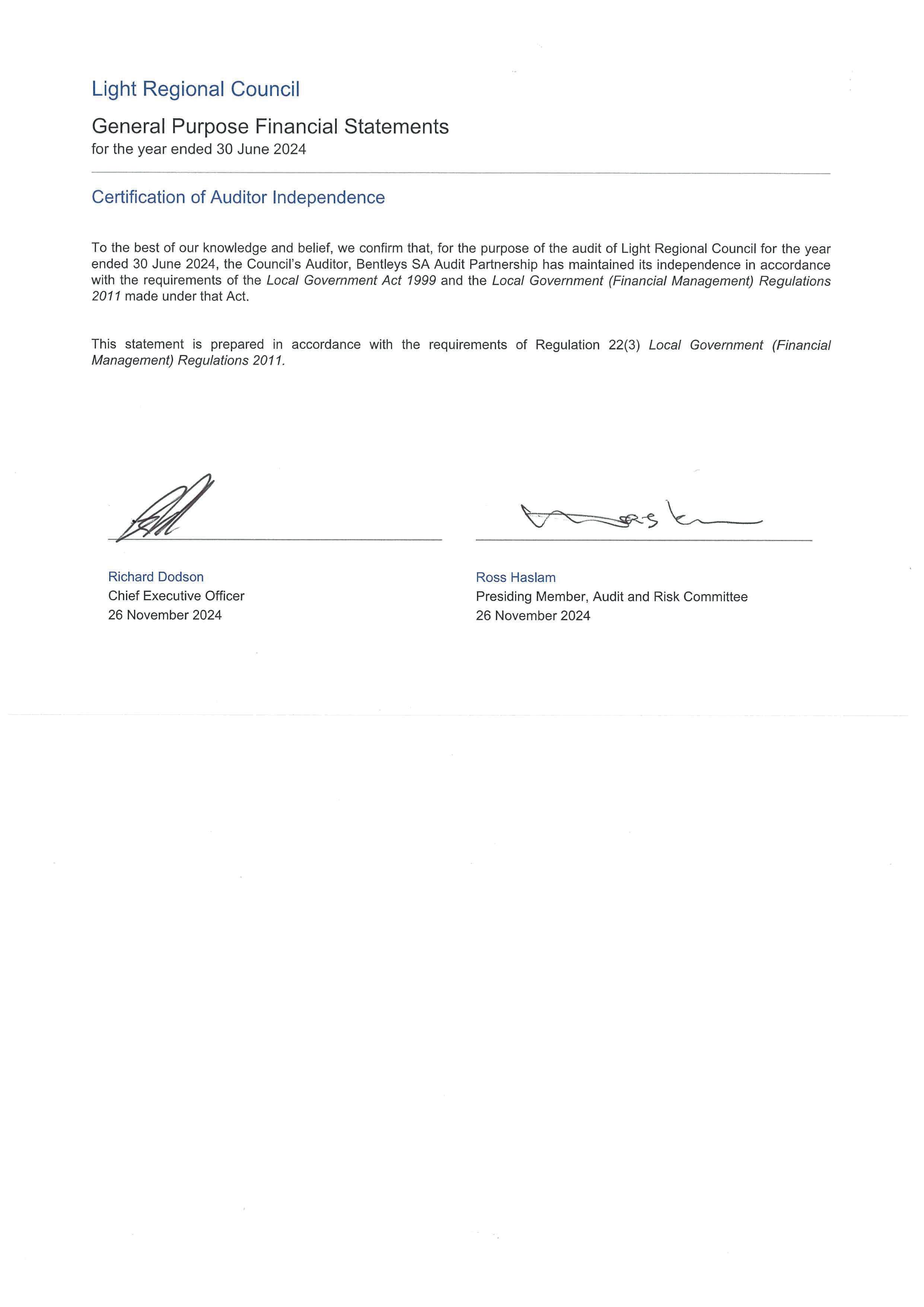 To the best of our knowledge and belief, we confirm that, for the purpose of the audit of the Gawler River Floodplain Management Authority for the year ended 30 June 2024 the Authority’s Auditor DeanNewbery has maintained its independence in accordance with the requirements of the Local Government Act 1999 and the Local Government (Financial Management) Regulations 2011 made under that Act.