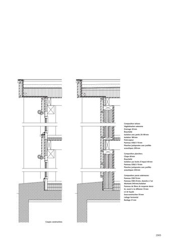 Composition toiture: Végétalisation extensive Drainage 20 mm Étanchéité Isolation avec pente 20–80 mm Isolation 180 mm Frein-vapeur Panneau OSB/3 15 mm Planches juxtaposées avec profilés acoustiques 200 mm Composition planchers: Chape 60 mm Étanchéité Isolation aux bruits d’impact 60 mm Panneau OSB/3 15 mm Planches juxtaposées avec profilés acoustiques 240 mm Composition parois extérieures: Panneau OSB 15 mm Panneau OSB 25 mm, étanche à l’air Montants 240 mm/Isolation Panneau de fibres de moyenne densité, ouvert à la diffusion 15 mm Lé de façade Sous-construction 55 mm Lattage horizontal Bardage 21 mm