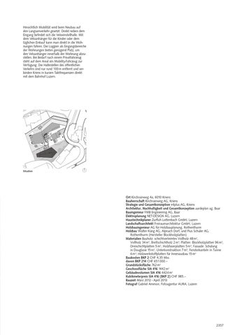 Ort Kirchrainweg 4a, 6010 Kriens Bauherrschaft Kirchrainweg AG, Kriens Strategie und Gesamtkonzeption e4plus AG, Kriens Architektur, Nachhaltigkeit und Gesamtkonzeption aardeplan ag, Baar Bauingenieur FMB Engineering AG, Baar Elektroplanung NET-DESIGN AG, Luzern Haustechnikplaner Zurfluh Lottenbach GmbH, Luzern Landschaftsarchitekt Freiraumarchitektur GmbH, Luzern Holzbauingenieur AG für Holzbauplanung, Rothenthurm Holzbau Walter Küng AG, Alpnach Dorf, und Pius Schuler AG, Rothenthurm (Hersteller Blockholzplatten) Materialien Bauholz: schichtverleimtes Vollholz 48 m3, Vollholz 34 m3, Brettschichtholz 2 m3; Platten: Blockholzplatten 96 m3, Dreischichtplatten 5 m3, Holzfaserplatten 5 m3; Fassade: Schalung in Douglasie 15 m3, Unterkonstruktion 7 m3; Fensterkanteln in Tanne 6 m3; Holzwerkstoffplatten für Innenausbau 15 m3 Baukosten BKP 2 CHF 4,35 Mio. davon BKP 214 CHF 651 000.– Grundstücksfläche 762 m2 Geschossfläche SIA 416 1442 m2 Gebäudevolumen SIA 416 4424 m3 Kubikmeterpreis SIA 416 (BKP 2) CHF 985.– Bauzeit März 2012 – April 2013 Fotograf Gabriel Ammon, Fotoagentur AURA, Luzern