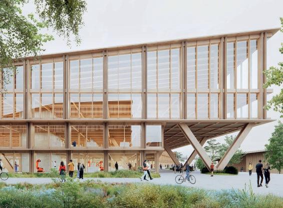 Einheit. Das Holz ist Mittel zum Zweck und gestaltet gleichzeitig den Raum. Etwas ähnliches passiert bei einem anderen geplanten Grossprojekt, dem neuen Ökotop Campus der Eidgenössischen Polytechnischen Hochschule Lausanne (EPFL). Diese hat dafür 3XN Architects und IB Itten Brechbühl im Rahmen einer Ausschreibung unter vier einge ladenen Projektteams mit der Planung und dem Bau beauftragt. Das Innovations Ökotop ist Teil eines strategischen Masterplans von insgesamt 250 000 m2, der das Ziel hat, in Ver bindung mit der EPFL einen sozialen, nachhaltigen und aktiven Standort für die techno logische Industrie zu schaffen. Das Projekt soll auf einer Fläche von 140 000 m2 den beste henden Wissenschaftspark der Hochschule an einem neuen Standort westlich des Campus erweitern. Betrachtet man die Visualisierungen der geplanten Neubauten mit dem Hauptge bäude an der südöstlichen Ecke des Geländes, fällt auch hier die Wirkung des gewählten Tragwerks in Holz auf, das zu einer raumbe stimmenden Komponente der Architektur wird – sowohl von aussen als auch im Inneren. Auch der Neubau der fünfschiffigen Produkti onshalle der SWG Schraubenwerk Gaisbach GmbH in Waldenburg in Deutschland ist ein Pionierprojekt des Ingenieurholzbaus, das ebenso architektonisch überzeugt. Dafür wur de der rund 12 m hohe Bau mit Abmessungen von 96,5 m Breite und 114 m Länge diesen Sommer mit dem Holzbaupreis Baden Würt temberg 2022 ausgezeichnet. Laut Jury ist das Bauwerk ‹ein leuchtendes Beispiel für zeitge mässe Industriearchitektur: ressourceneffizient, nachhaltig und schön.›
