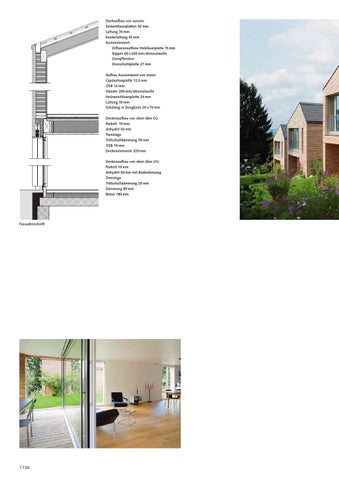 Dachaufbau von aussen: Zementfaserplatten 30 mm Lattung 30 mm Konterlattung 55 mm Kastenelement: Diffusionsoffene Holzfaserplatte 15 mm Rippen 60 x 200 mm/Mineralwolle Dampfbremse Dreischichtplatte 27 mm Aufbau Aussenwand von innen: Gipskartonplatte 12,5 mm OSB 12 mm Ständer 200 mm/Mineralwolle Holzweichfaserplatte 24 mm Lattung 30 mm Schalung in Douglasie 20 x 70 mm Deckenaufbau von oben über EG: Parkett 10 mm Anhydrit 50 mm Trennlage Trittschalldämmung 30 mm OSB 10 mm Deckenelemente 320 mm Deckenaufbau von oben über UG: Parkett 10 mm Anhydrit 50 mm mit Bodenheizung Trennlage Trittschalldämmung 20 mm Dämmung 80 mm Beton 180 mm