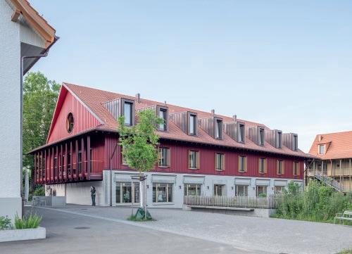 Der Neubau fügt sich mit seiner Fassadenabwicklung, die sich aus der inneren Raumkonzeption ergibt, subtil in den Bestand ein und entwickelt als Baukörper gleichzeitig eine starke Präsenz. Der Holzbau schreibt Bautraditionen und Handwerkskunst zeitgemäss fort, während die Innenräume dank des Materials und der Raumwahrnehmung eine hohe Aufenthaltsqualität entfalten.